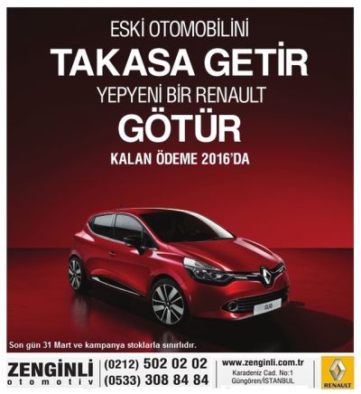 Eski aracınızı 31 Mart'ta kadar getiriyorsunuz, yerine yepyeni bir otomobil alabiliyorsunuz. Kalan ödeme için telaş etmenize gerek yok. Zenginli Otomotiv bütçenizi zorlamayacak bir tarih ile sizi 'Sıfır' otomobil sahibi yapacak. Kalan ödeme: 2016'da